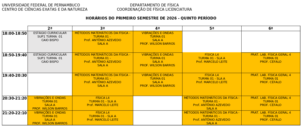 - Horário do Quinto Periodo