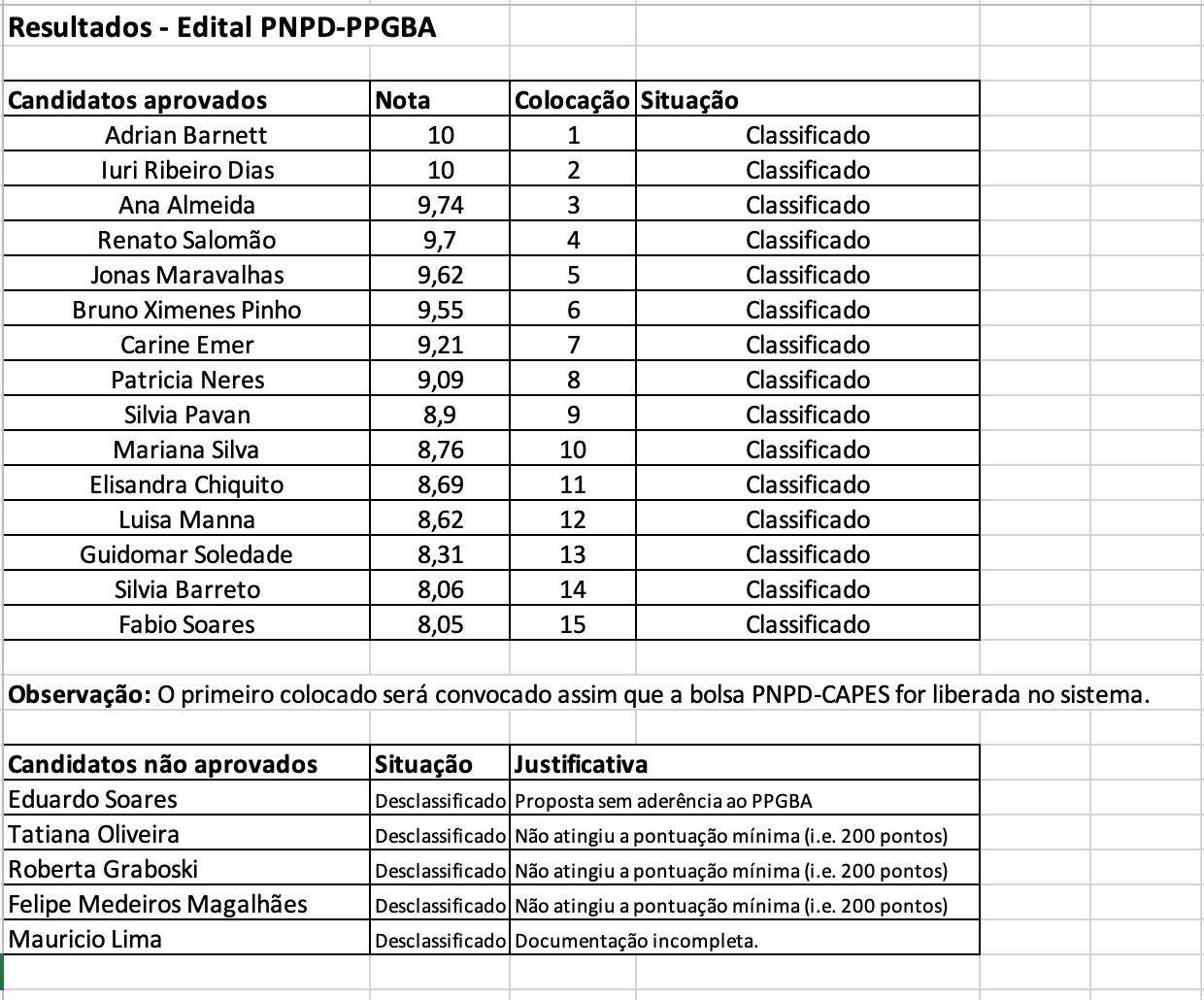 Obs. O primeiro colocado será contactado assim que a bolsa PNPD entrar no sistema.