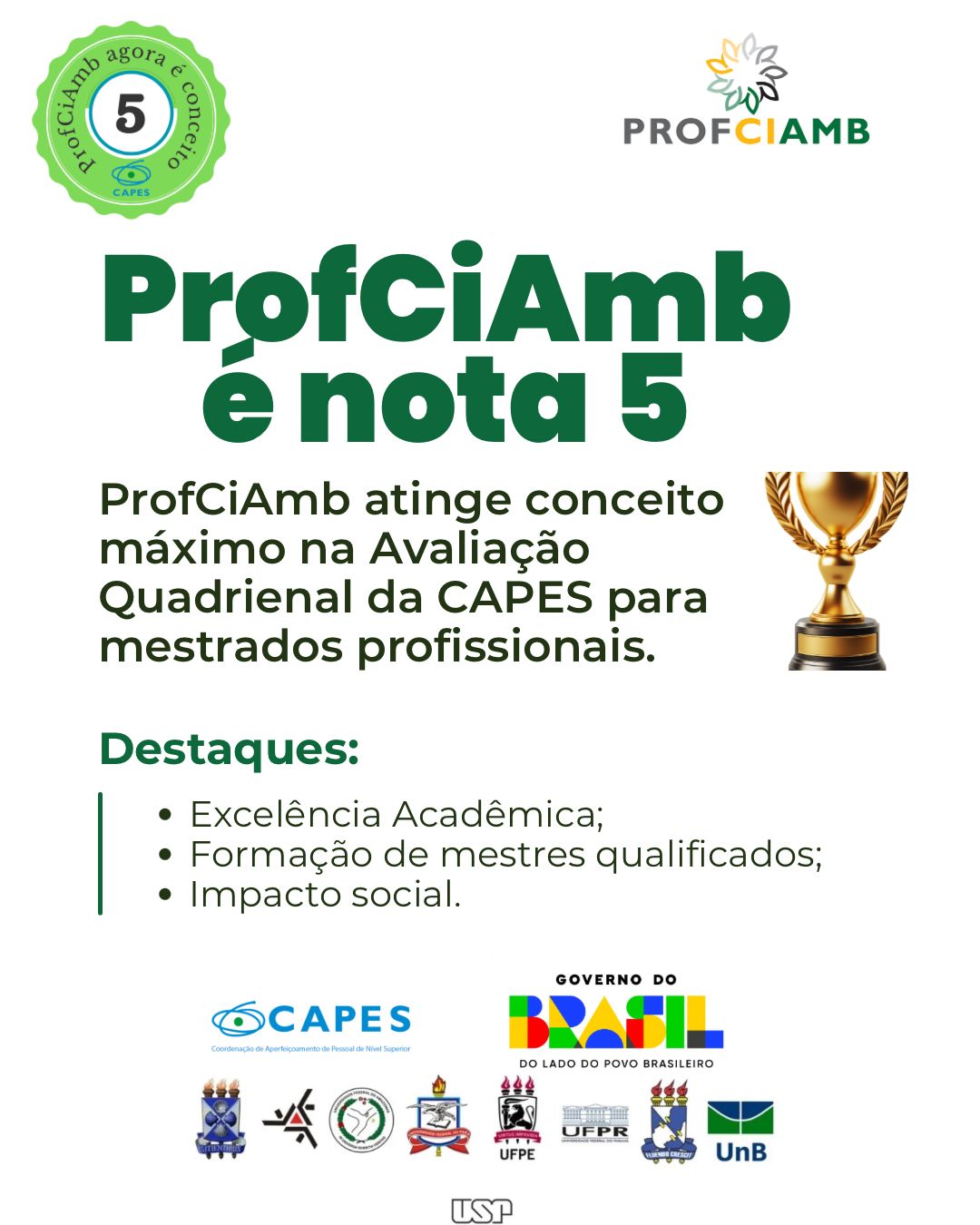 O ProfCiAmb agradece a toda sua comunidade por este excelente resultado que reflete o comprometimento de todos e a qualidade dos trabalhos desenvolvidos no Programa.