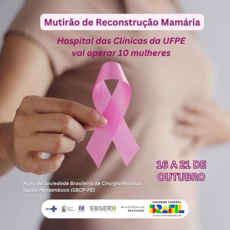O Hospital das Clínicas da UFPE vai operar dez mulheres que têm indicação de cirurgia de reconstrução mamária, no período de 16 até 21 de outubro. A iniciativa integra o mutirão promovido pela Sociedade Brasileira de Cirurgia Plástica – Seção Pernambuco (SBCP-PE), que pretende operar 80 mulheres, em hospitais de referência do Recife, em celebração ao Outubro Rosa, mês de conscientização sobre a prevenção e diagnóstico precoce do câncer de mama. O HC é uma unidade vinculada à Empresa Brasileira de Serviços Hospitalares (Ebserh).