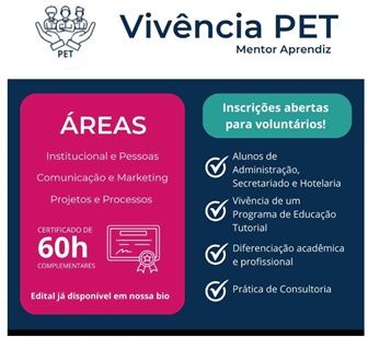 Projeto Vivências PET Mentor Aprendiz recebe inscrição para alunos voluntários